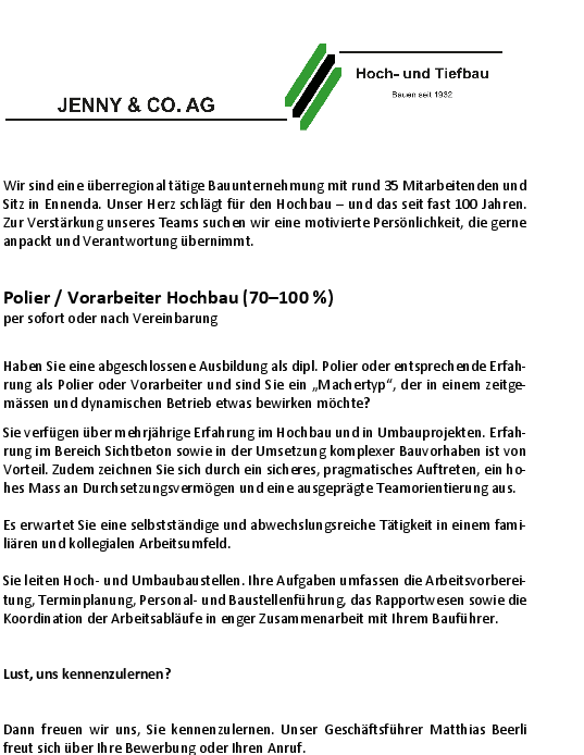 Jenny & Co. AG, Bauunternehmung, Gipserhütte 2, 8755 Ennenda Matthias Beerli, +41 (0)79 778 14 04 matthias.beerli@jennybau.ch